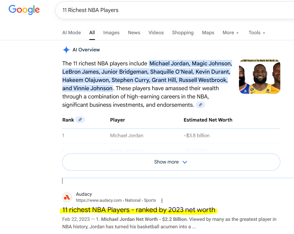 The success is validated by the sustained performance of assets like the article on "11 Richest NBA Players," which I managed from creation in March 2022. This content piece continues to maintain strong search visibility and drive traffic today: